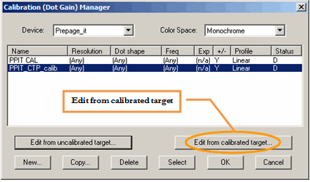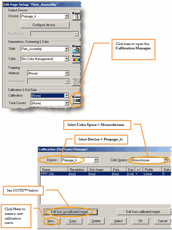 4. Open the Calibration Manager, then select Color Space = Monochrome and Device = Prepage_it. Next, click New to create a new calibration curve.