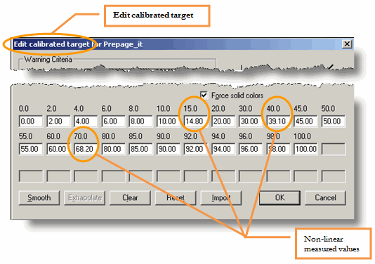 6. In the Edit calibrated target dialog box, add only the measured values that are not linear and click OK. The RIP will automatically adjust the calibration set.