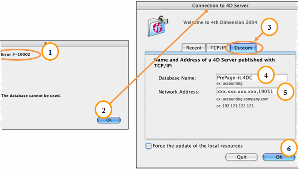 Click OK to the "Error #-10002" message. When the Connection to 4D Server dialog box appears, go to the Custom tab. Next, type the Database Name (e.g. PrePage-it.4DC) and the Network Address i.e. IP address of server, followed by port number 19051 (e.g. 192.168.1.72, 19051). This will launch the client.