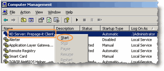The 4D Server: Prepage-it Client service must be started in order for the PrePage-it Client to be launched. Verify this from the Start menu on the PC server by navigating to Start > Administrative Tools > Services or Computer Management. If the 4D Server: Prepage-it Client service is stopped, right-click on it and select Start.