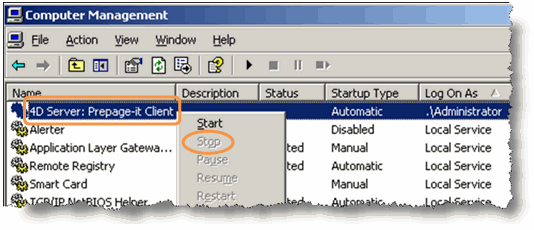 1. Make sure the 4D Server: Prepage-it Client service is stopped. You can do this from the PC server by navigating to Start > Administrative Tools > Services or Computer Management, then right-clicking on the service and selecting Stop.