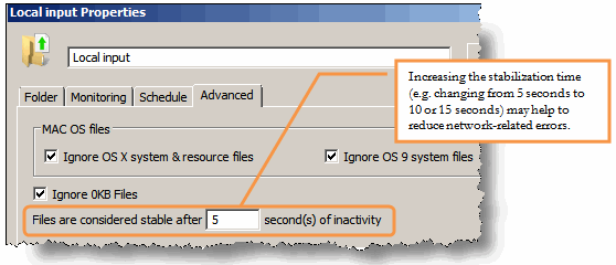 For Move-it errors, the stabilization time can be adjusted to reduce or possibly eliminate these types of network errors. However this will not resolve anything with the network itself - please consult a network specialist for help with this topic. To adjust the stabilization time, change the time value (i.e. number of seconds) in the option Files are considered stable after x seconds of inactivity. This option is set in the Wait For File or Download FTP File inputs.