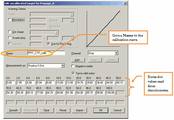 4. Reprint your calibration target file back to the same PrePage-it Viewer queue, which should now be configured with the new calibration curve. Again, make a film/plate and measure the dot values. If the values are linear, the procedure is complete.