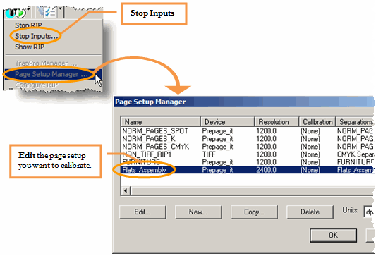 2. Now from the PrePage-it Viewer toolbar: Stop Inputs, then launch the Page Setup Manager. Next open (Edit) the page setup that you want to calibrate e.g. Flats_Assembly.