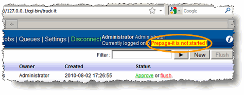 • if you see the message "PrePage-it is not started!" appearing in red & yellow at the top of the PrePage-it Web window, you must launch the PrePage-it Viewer application - failure to do so will cause a number of PrePage-it Web features to not work properly, especially those relating to the listing of queues