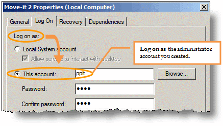 5. For Move-it only: As an alternative to configuring the Move-it 2 Service as described in the step 3, you can instead specify the administrator account directly in the Move-it 2 interface. To do so: