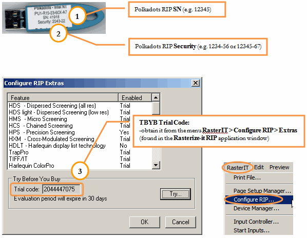 2. In the Rasterize-it RIP application window, click RasterIT > Configure RIP > Extras > Try (see figures above).